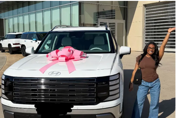 Taking to Instagram, Rachel posted a series of photos that caught attention. In the first image, she stands in a garage beside a brand-new white Hyundai Palisade SEL FW. Even a large pink ribbon was stretched across the hood of the car.